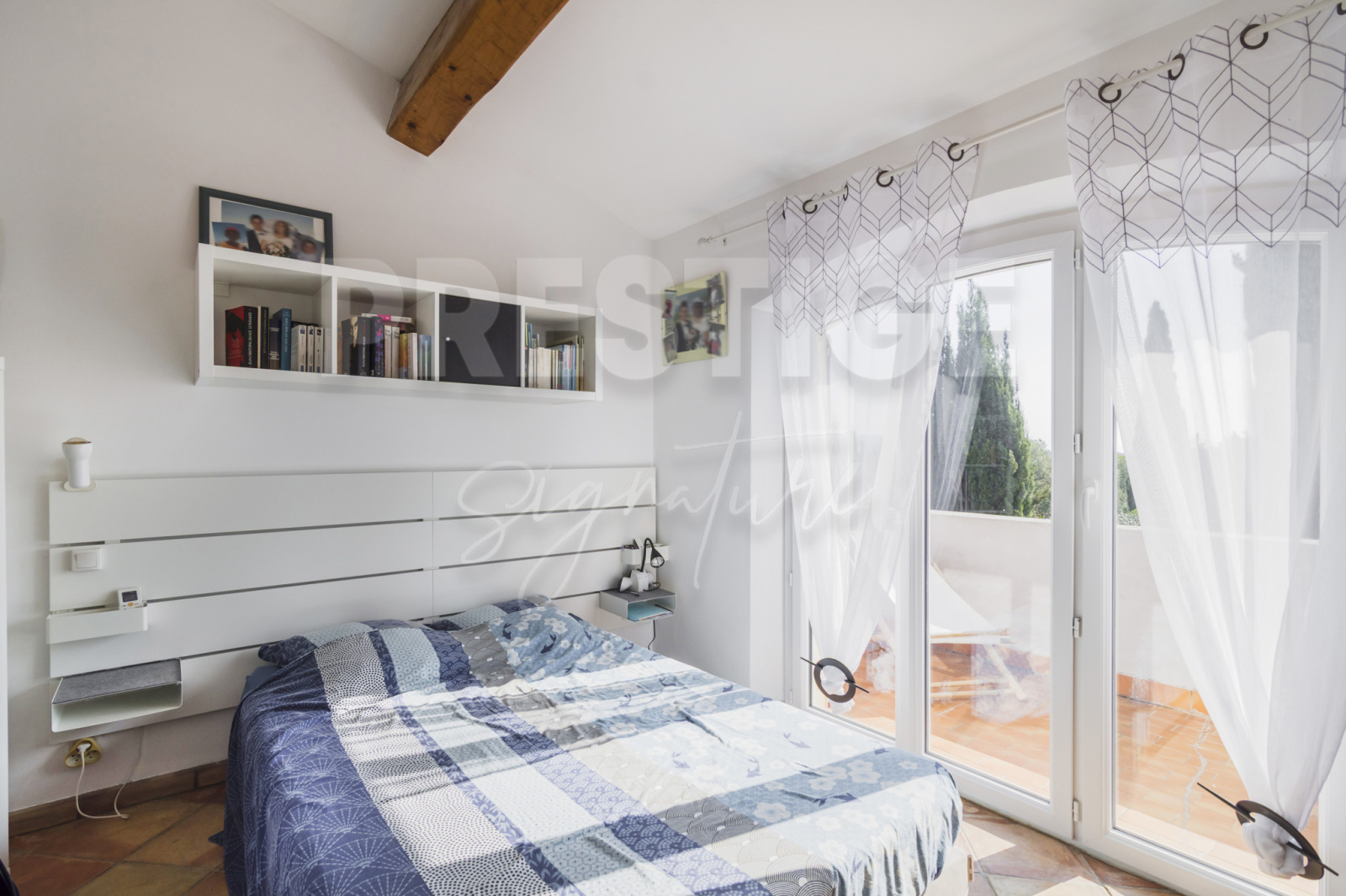 À l’étage, vous trouverez trois belles chambres aux poutres apparentes offrant une superbe hauteur sous plafond. L’une d’elles dispose d’une terrasse privative avec vue dégagée sur les oliviers et la campagne environnante. Une salle d’eau commune complète cet espace nuit agréable et lumineux.