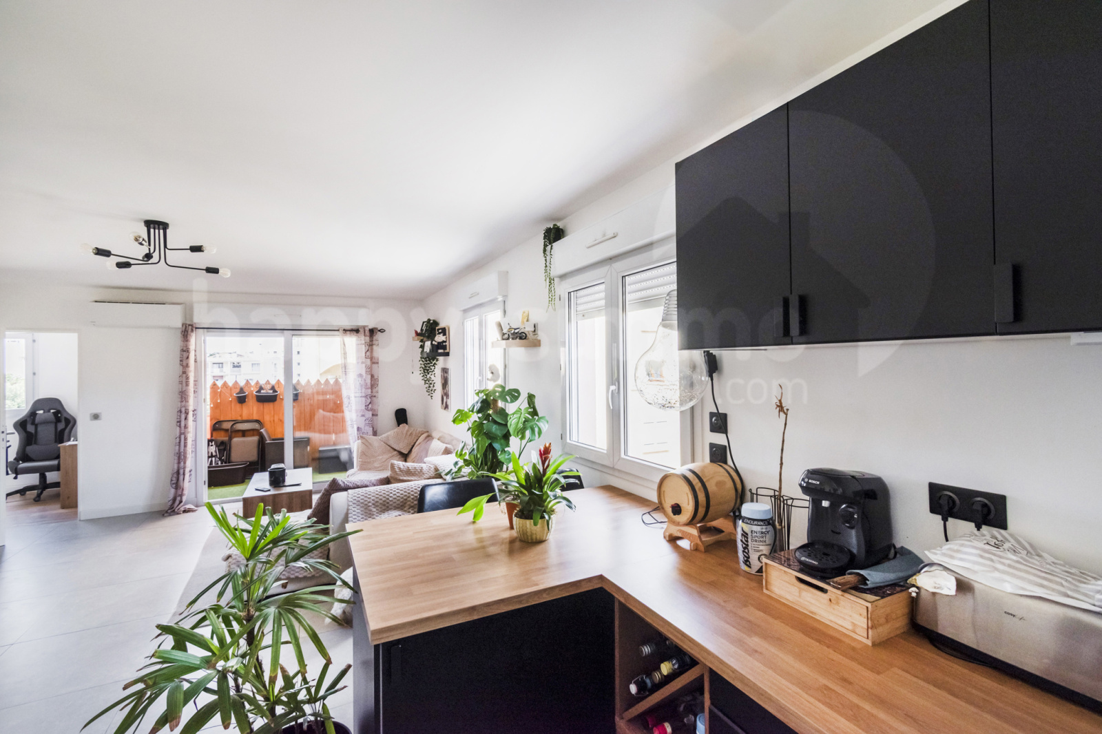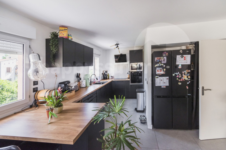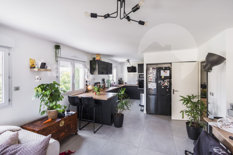 Vaste séjour avec cuisine ouverte haut de gamme, entièrement équipée (four, micro-ondes, lave-vaisselle intégrés, nombreux rangements), ouvrant sur un joli balcon de 6 m² exposé plein soleil, parfait pour vos moments de détente.