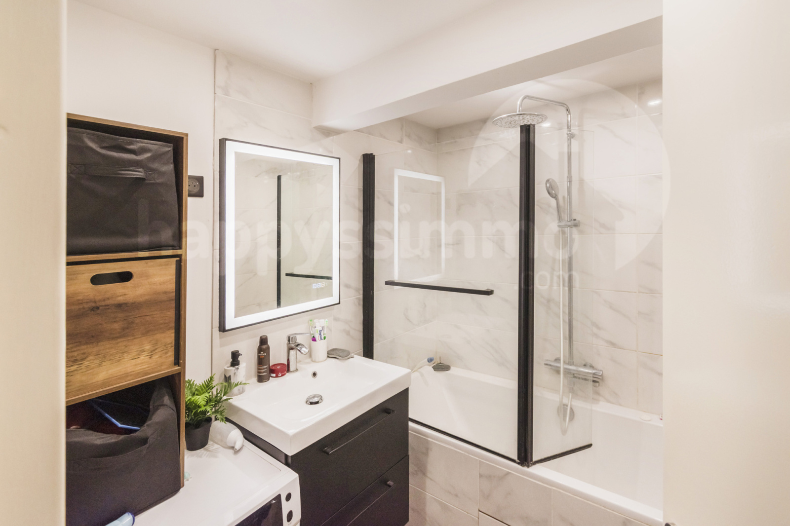 Salle de bains contemporaine, WC séparé, double vitrage, volets roulants électriques, climatisation réversible, éclairage LED intégré.
