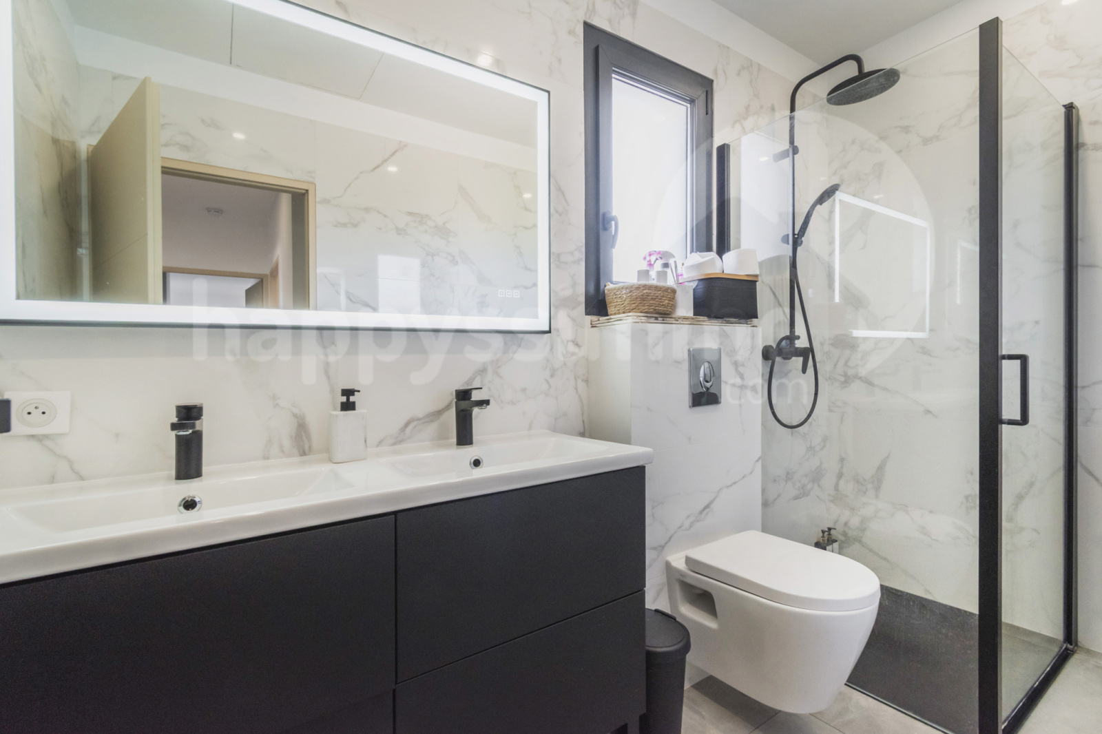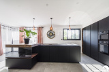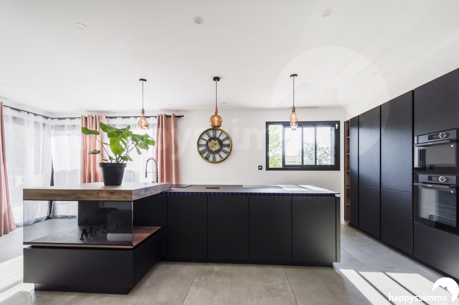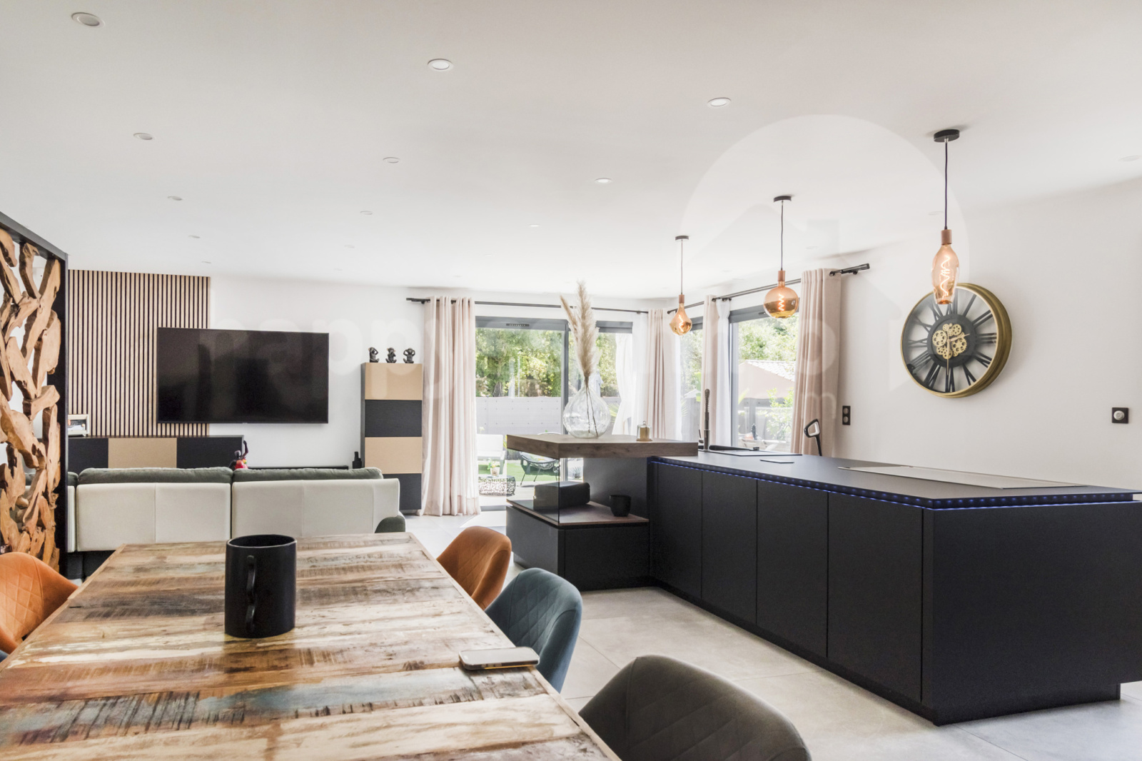 Au RDC, une entrée, une buanderie, un wc séparé, une suite parentale avec salle d'eau, une cuisine équipée, moderne ouverte sur un vaste séjour de 60 m².