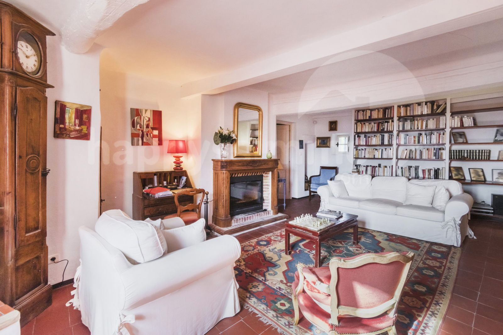 - Au 1er étage avec un escalier dans l'entrée, une bibliothèque de 20 m², un salon avec cheminée, une suite parentale avec dressing et salle de bains.