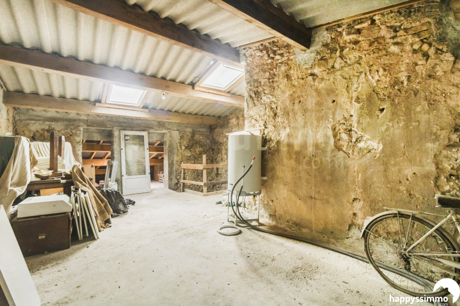 Double vitrage, PVC, velux, poutres à la française, conduit de cheminée prévu.
