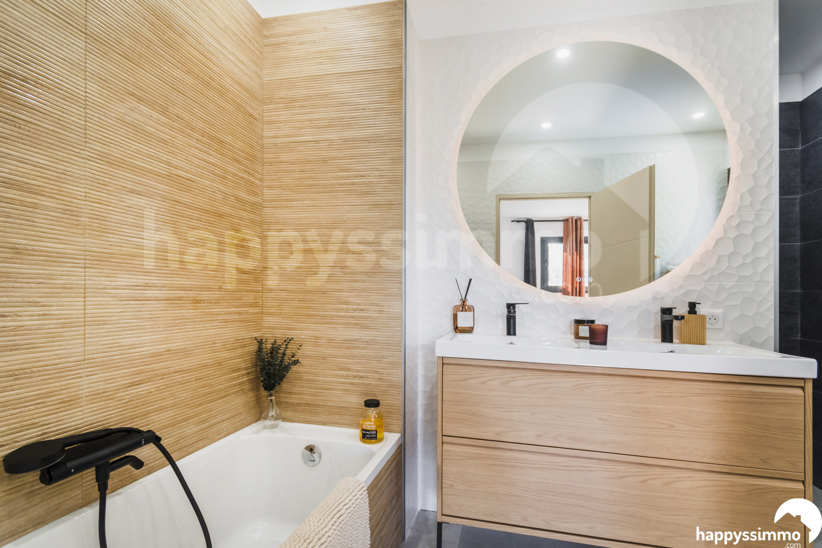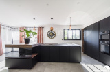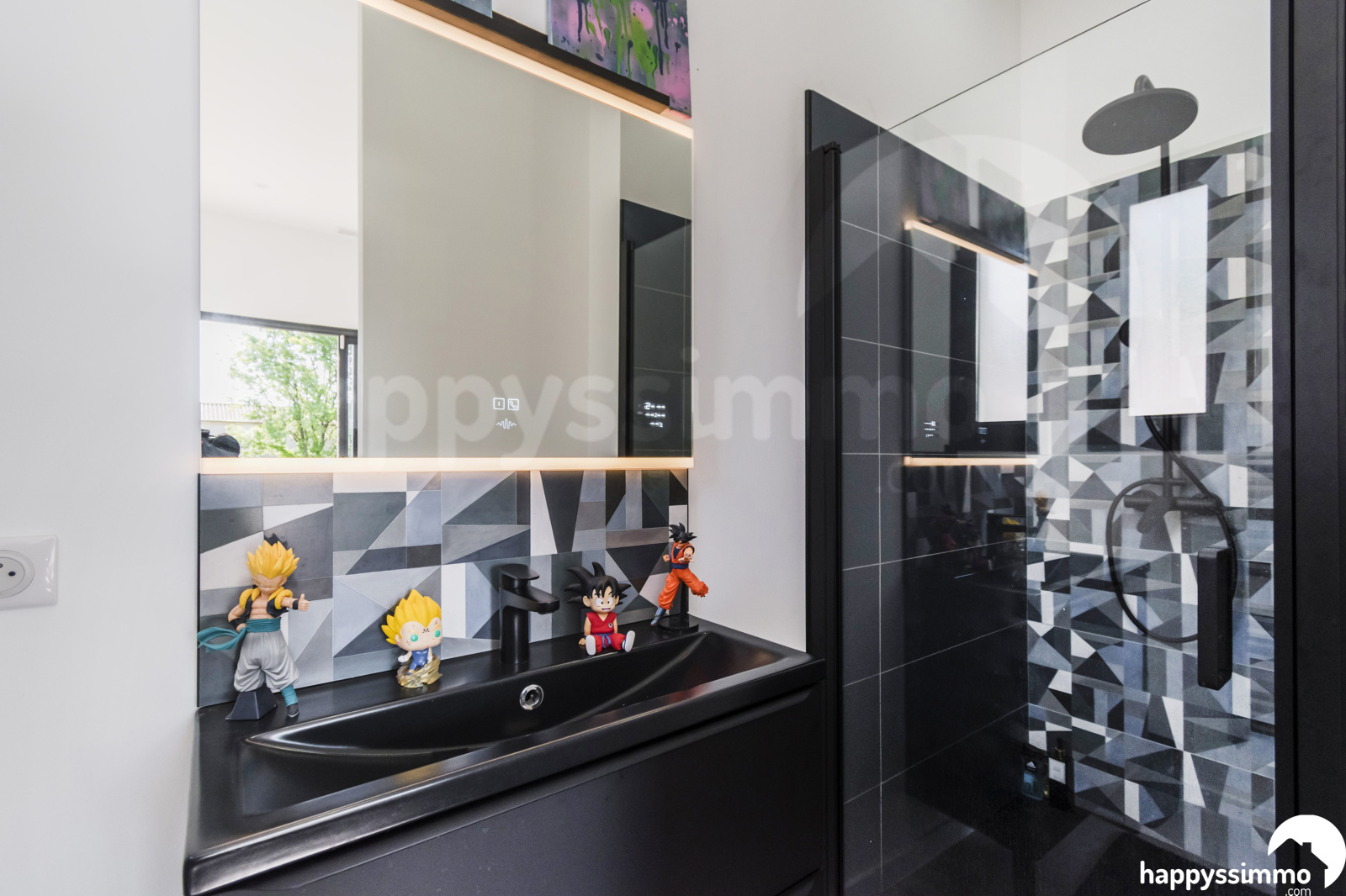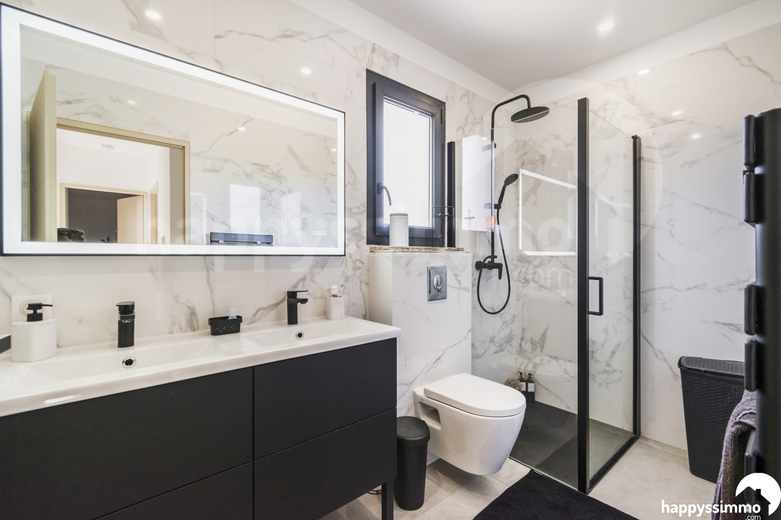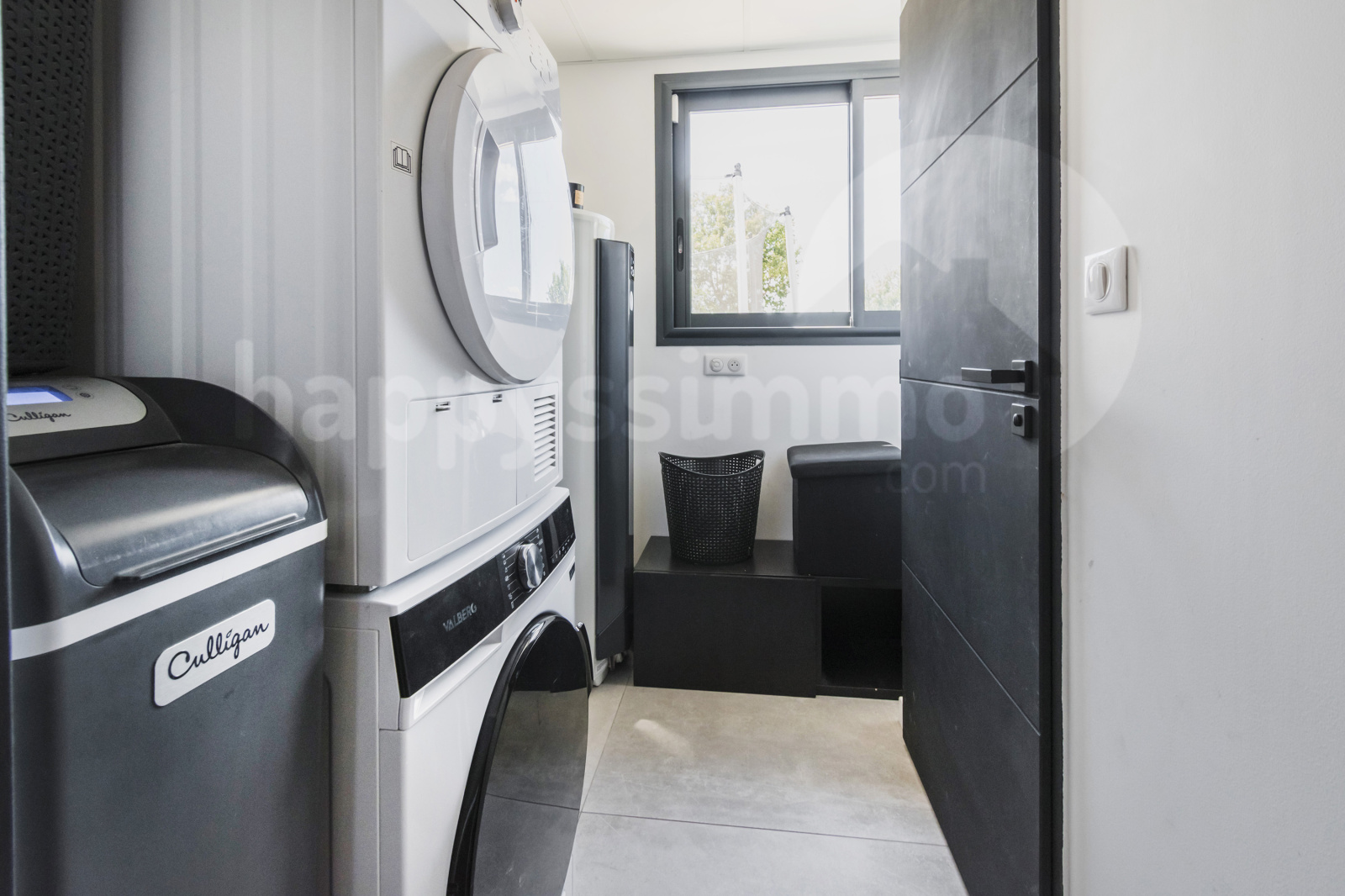 Au RDC, une entrée, une buanderie, un wc séparé, une suite parentale avec salle d'eau, une cuisine équipée, moderne ouverte sur un vaste séjour de 60 m².