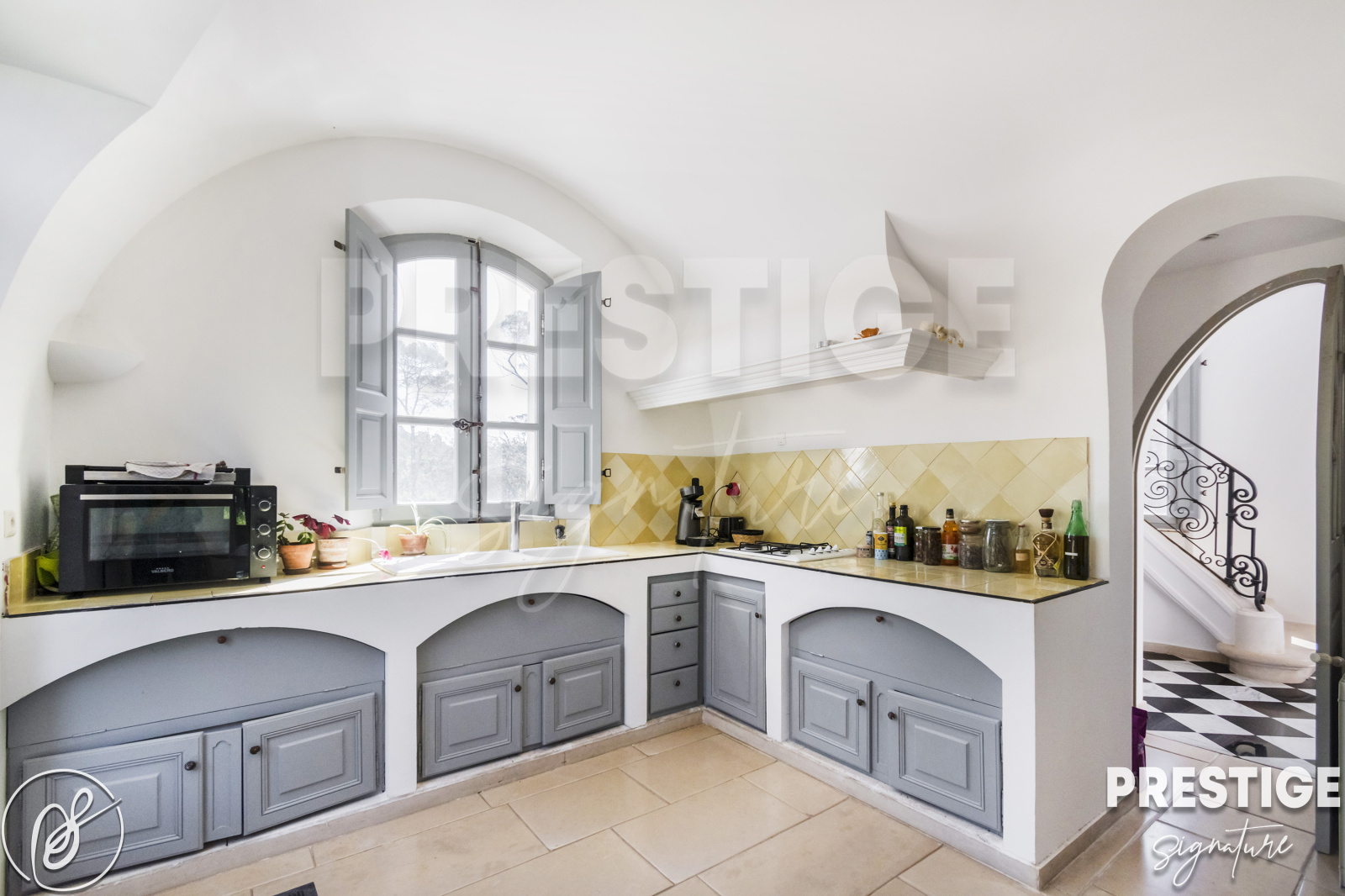 La bâtisse dispose d'une vaste entrée, d'une cuisine dînatoire ouverte sur la terrasse, d'une salle à manger, d'un salon et d'un wc indépendant.