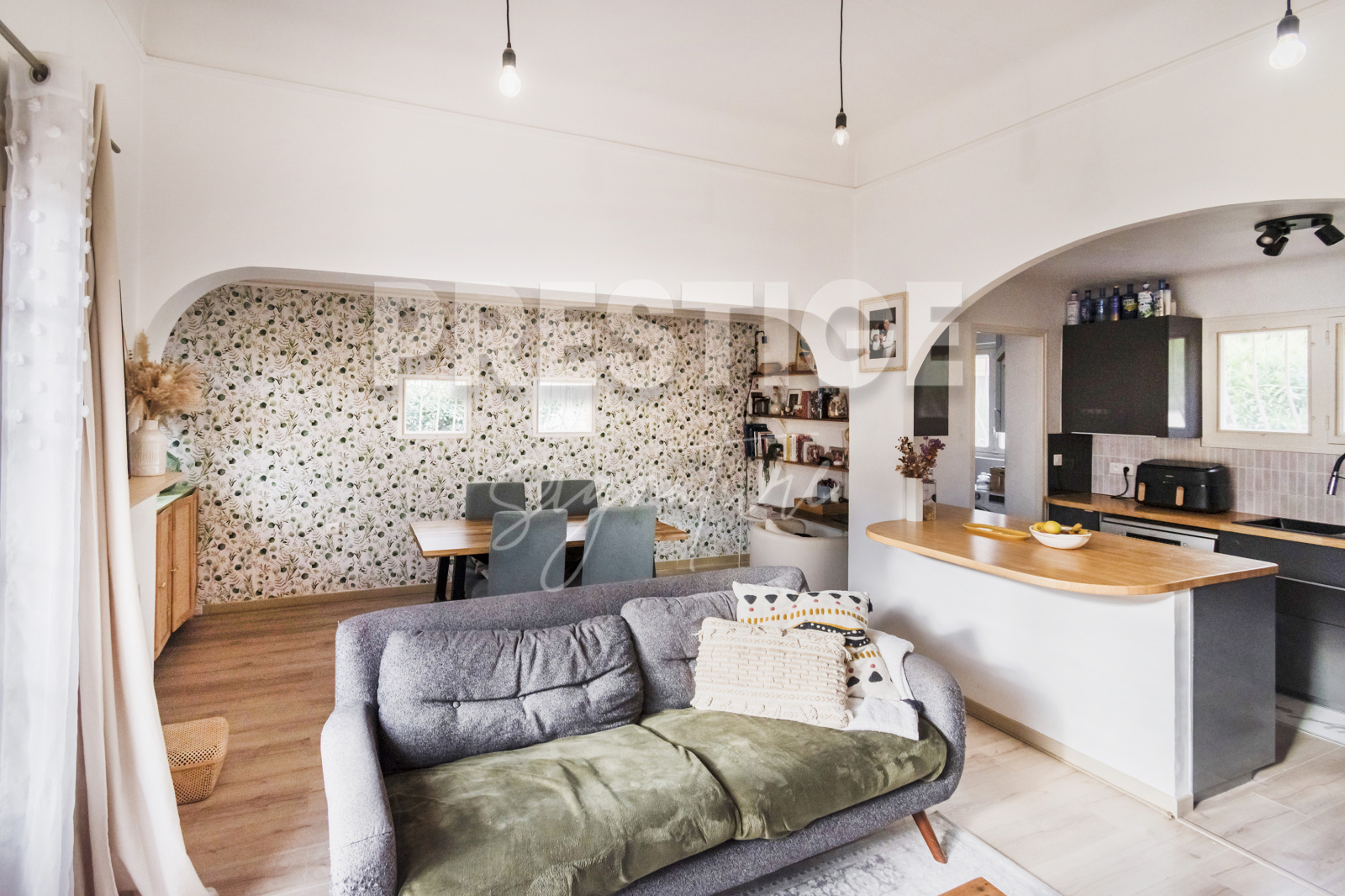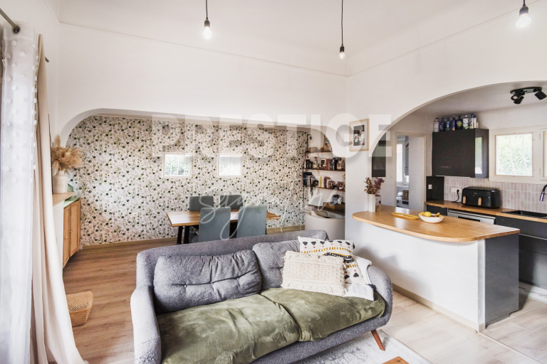 La maison est actuellement de plain pieds. Elle se compose d’un salon séjour ouvert sur le jardin, avec un espace salle à manger niché dans une alcôve ainsi qu’ une cuisine ouverte moderne entièrement équipée.
